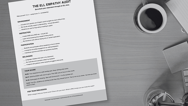 Gut-check your classroom through an ELL lens. Rate yourself across Environment, Instruction, Participation, and Belonging - then see where your students might be working harder than they should have to. Perfect for personal reflection or group