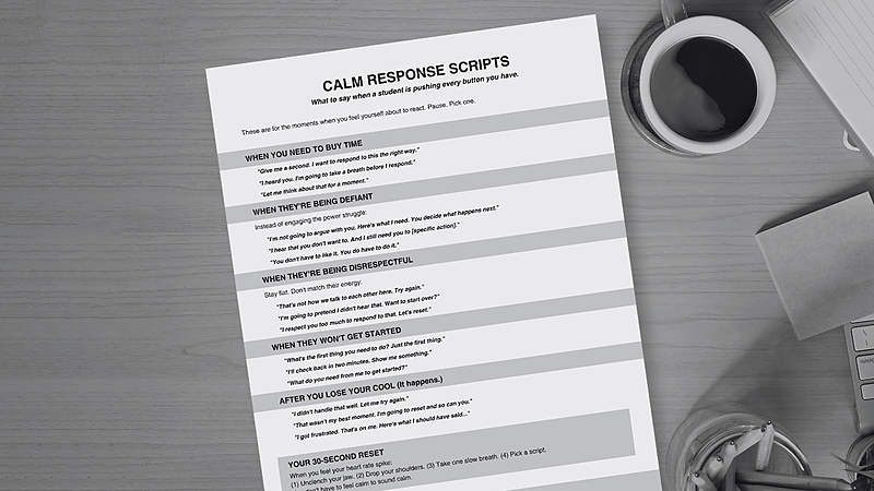 What to say when a student is pushing every button you have. Scripts for buying time, handling defiance, responding to disrespect, and resetting after you lose your cool (it happens). You don't have to feel calm to sound calm.