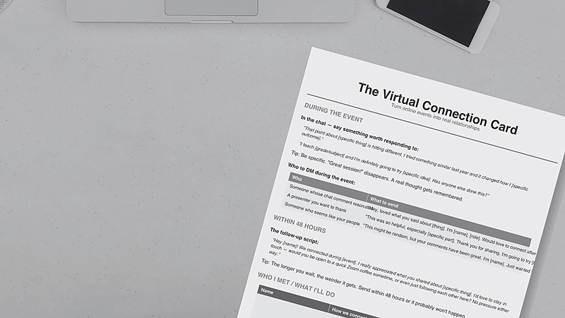 Scripts for actually connecting at virtual events. What to say in the chat, who to DM, and the 48-hour follow-up. One page to turn online events into real relationships.