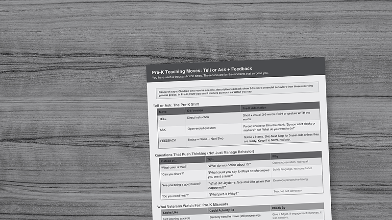 A one-page reference adapting Tell or Ask and the feedback formula for 3-5 year olds. Includes questions that push thinking, Pre-K misread guide, and a 3-day pattern tracker. For paras who have seen a thousand circle times and still show up ready.