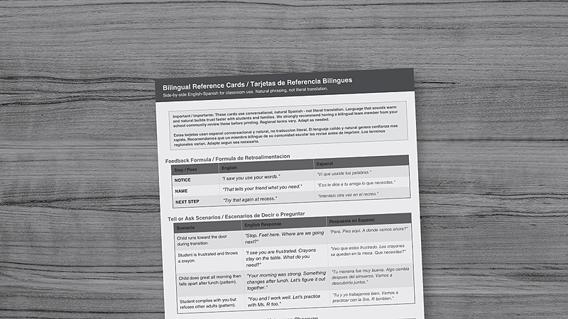Side-by-side English-Spanish reference for the feedback formula, Tell or Ask scenarios, and the misread guide. Natural phrasing, not literal translation. Includes a 3-day pattern tracker in both languages. Review with a bilingual team member first.