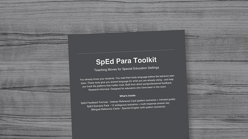 Everything a SpEd para needs in one printable bundle: the feedback formula reference card, 12 ambiguous scenario cards with answer key, and bilingual reference cards. Veteran-calibrated, research-informed, and built from direct para feedback.