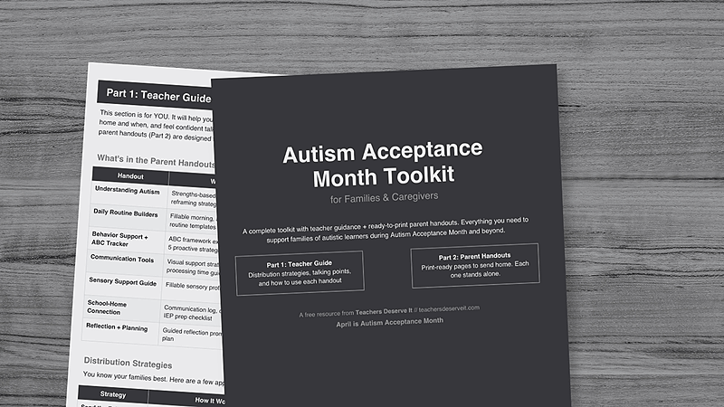 Supporting autistic learners starts with supporting their families. This toolkit gives you a teacher guide with distribution strategies and talking points, plus print-ready parent handouts covering routines, behavior, sensory needs, and more.