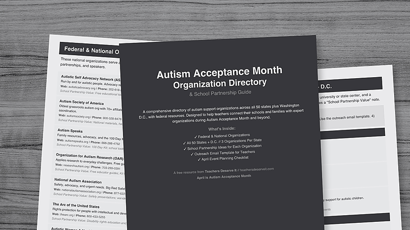 Connect your school with autism organizations in all 50 states plus D.C. Includes 150+ organizations with school partnership ideas, a ready-to-send outreach email template, and an April event planning checklist. Everything you need to get started.