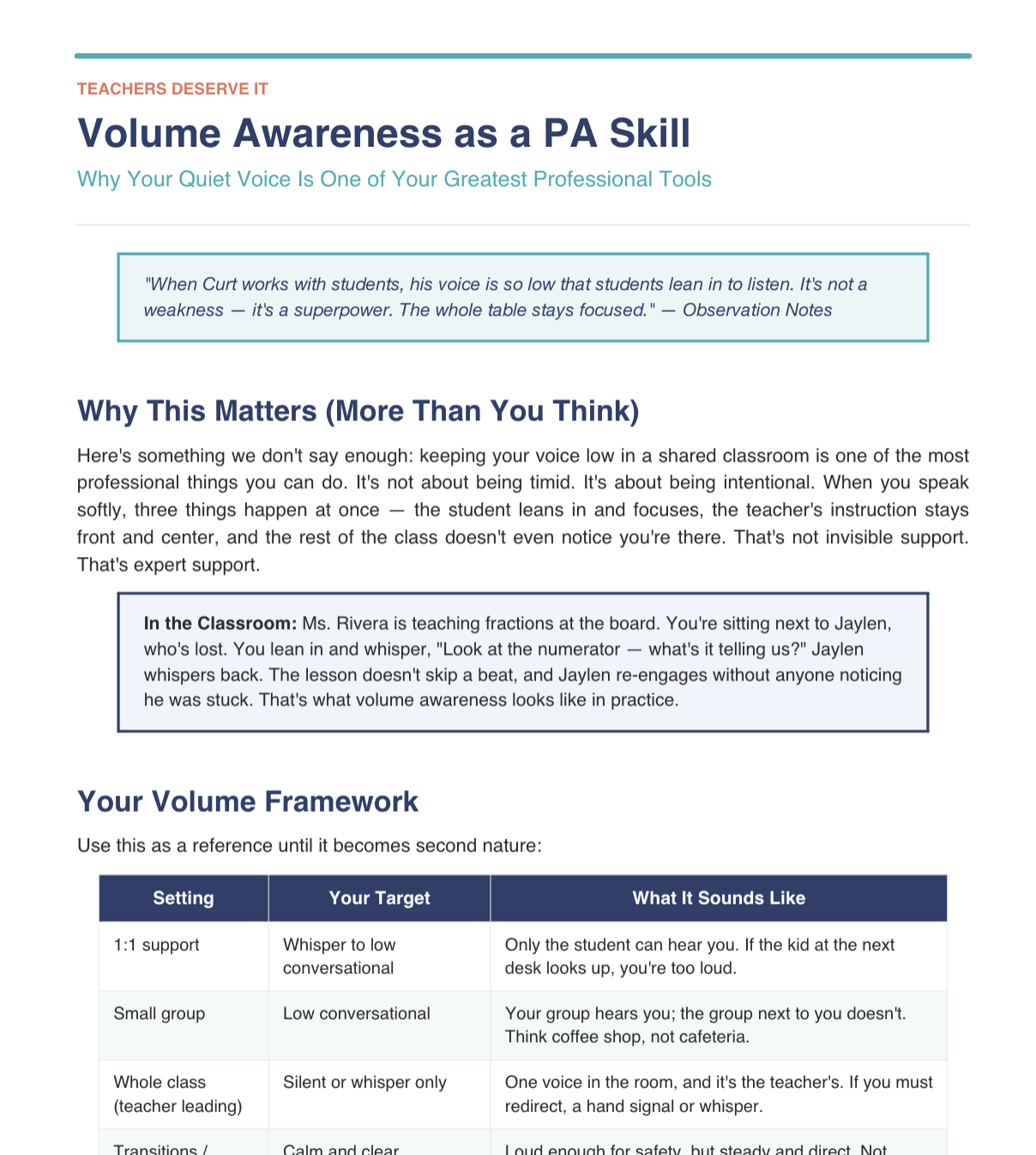 Learn to match your volume to the moment. This guide gives PAs a practical framework for voice levels across 6 classroom settings, plus a self-check, real scenarios, and a weekly challenge to build awareness fast.
