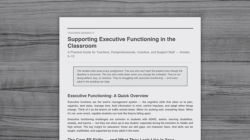 A whole-team guide to supporting students who struggle with focus, organization, and follow-through. Covers 9 EF skills, classroom strategies by challenge type, a 12-item checklist, and team alignment tips.